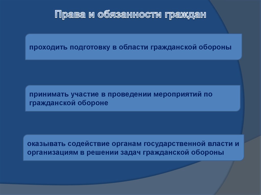 проходить подготовку в области гражданской обороныпринимать участие в проведении мероприятий по