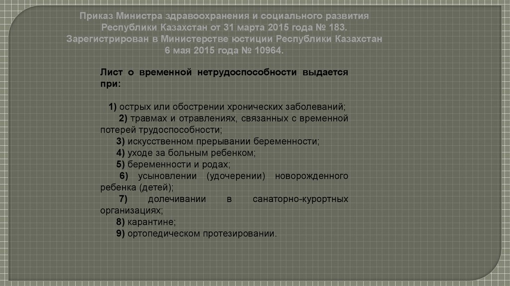 Приказ Министра здравоохранения и социального развитияРеспублики Казахстан от 31 марта 2015 года № 183.