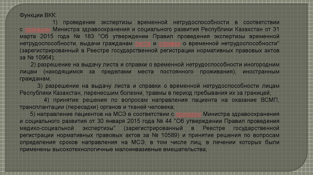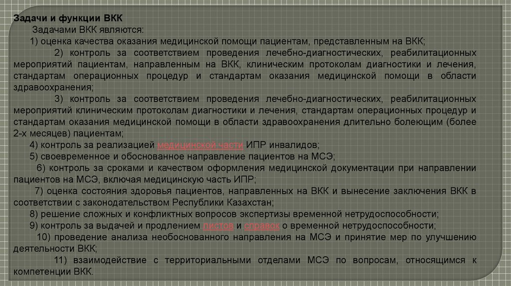 Функции ВКК:1) проведение экспертизы временной нетрудоспособности в соответствии