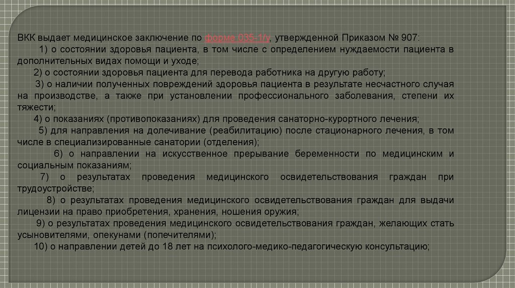 ВКК выдает медицинское заключение по форме 035-1/у, утвержденной Приказом № 907:1) о состоянии здоровья пациента, в том числе с определением нуждаемости пациента в