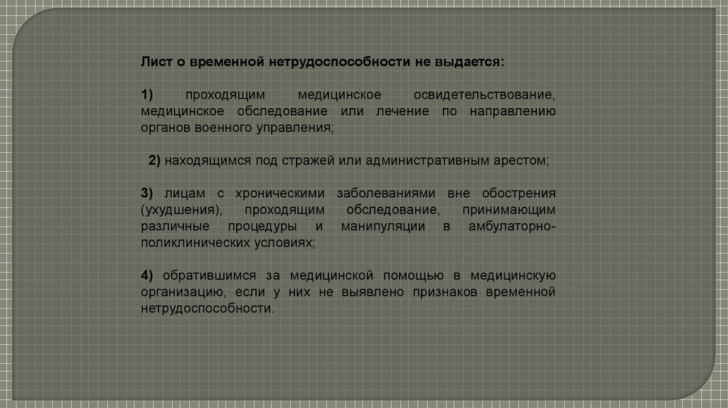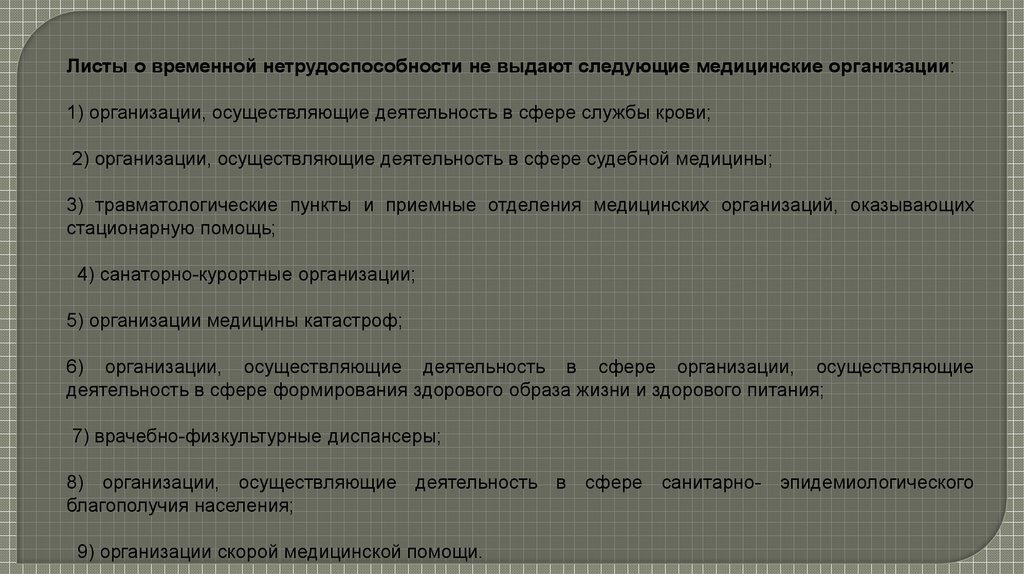 Листы о временной нетрудоспособности не выдают следующие медицинские организации:1) организации, осуществляющие деятельность в сфере службы крови;