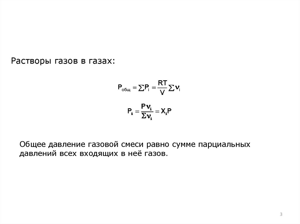 Растворы газов в газах:Общее давление газовой смеси равно сумме парциальных