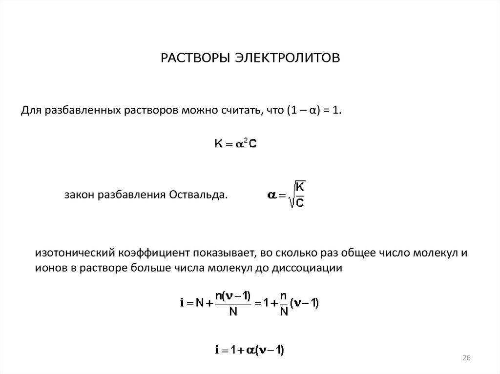 РАСТВОРЫ ЭЛЕКТРОЛИТОВДля разбавленных растворов можно считать, что (1 – α) = 1.