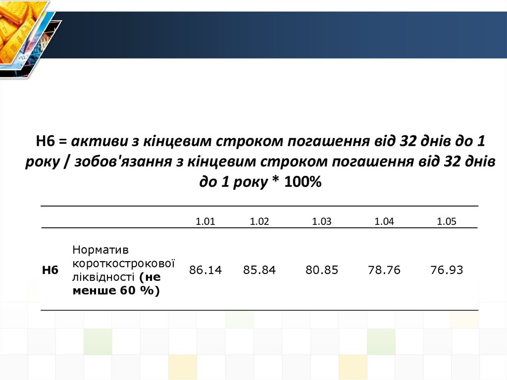 Н6 = активи з кінцевим строком погашення від 32 днів до 1року / зобов'язання з кінцевим строком погашення від 32 днів