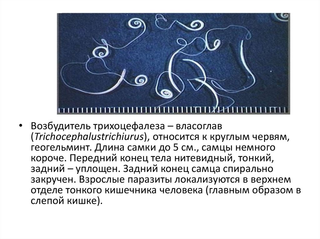 • Возбудитель трихоцефалеза – власоглав(Trichocephalustrichiurus), относится к круглым червям,