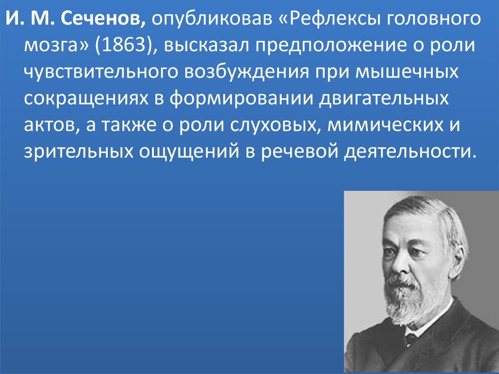 И. М. Сеченов, опубликовав «Рефлексы головногомозга» (1863), высказал предположение о роли