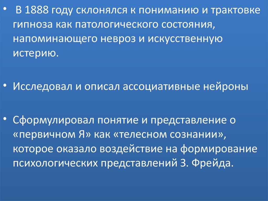 • В 1888 году склонялся к пониманию и трактовкегипноза как патологического состояния,