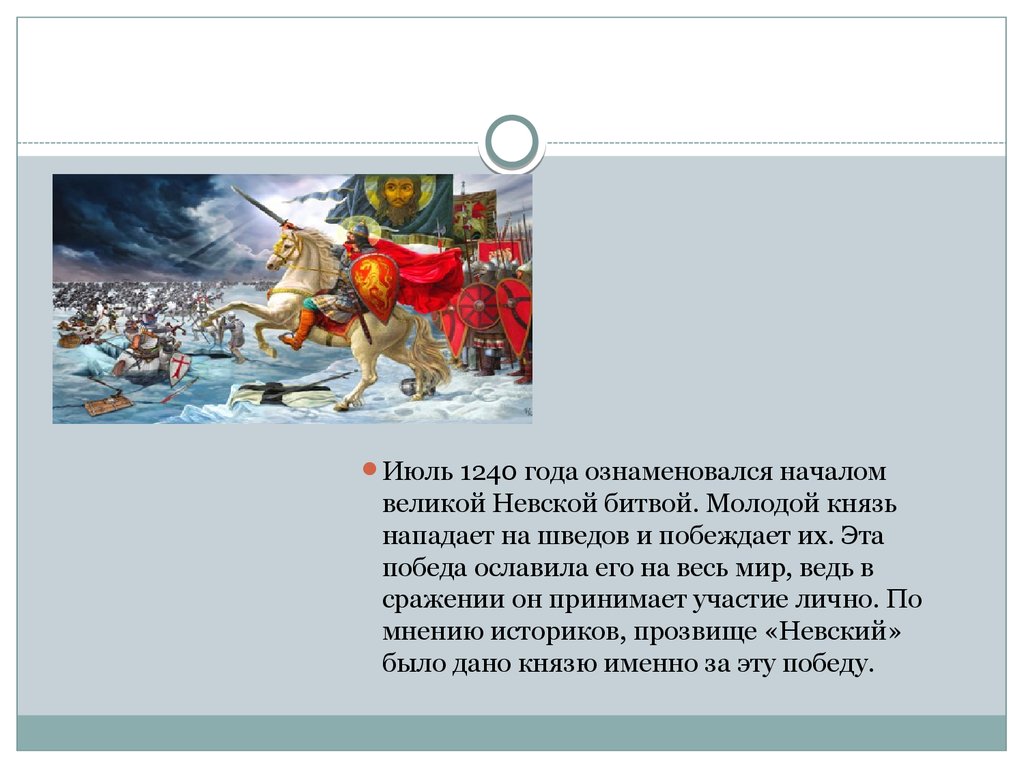 Июль 1240 года ознаменовался началомвеликой Невской битвой. Молодой князь