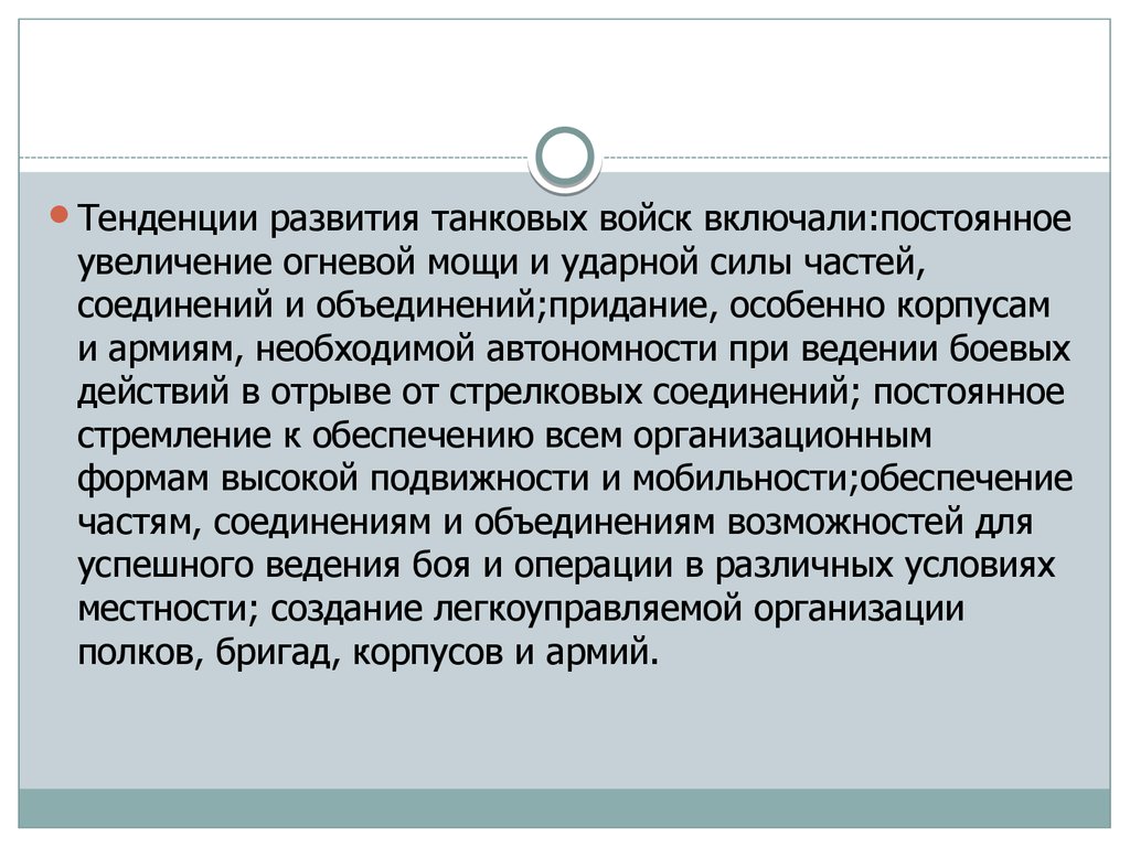 Тенденции развития танковых войск включали:постоянноеувеличение огневой мощи и ударной силы частей,