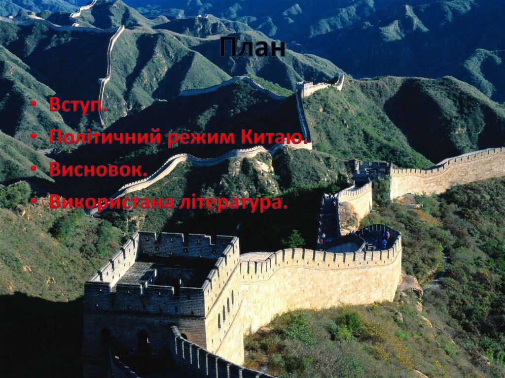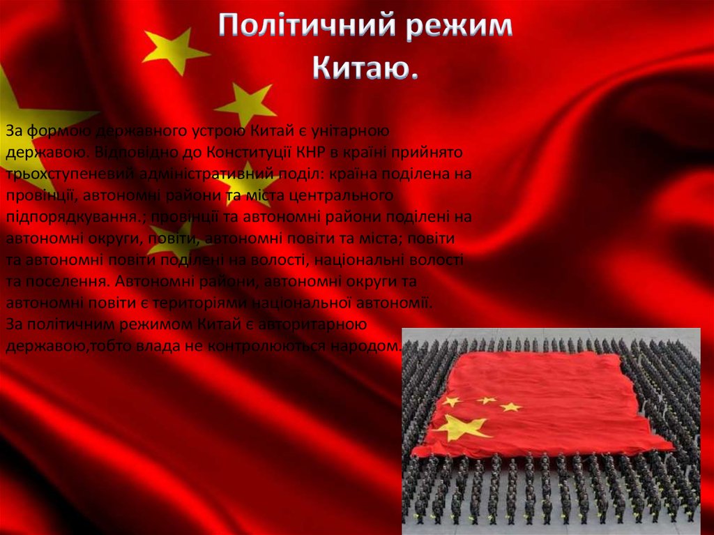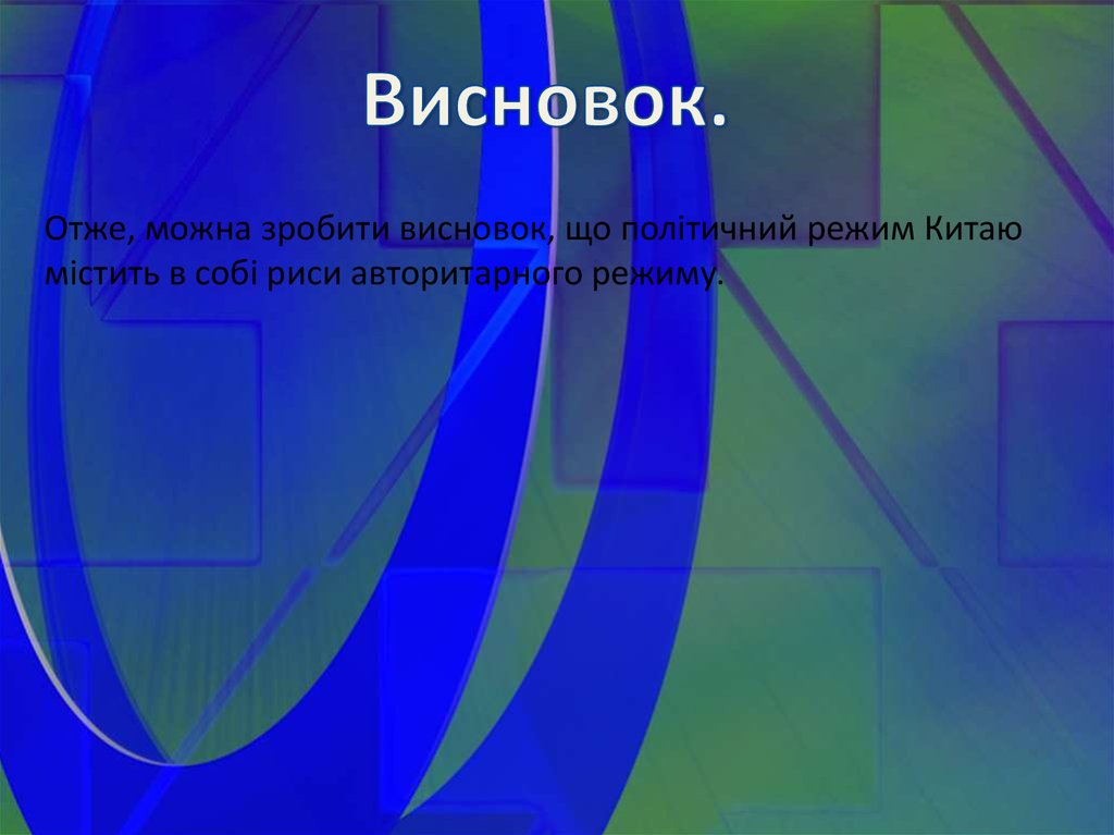 Отже, можна зробити висновок, що політичний режим Китаюмістить в собі риси авторитарного режиму.