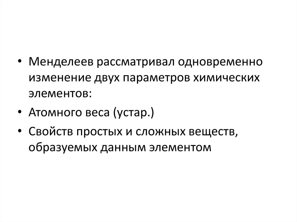 • Менделеев рассматривал одновременноизменение двух параметров химических