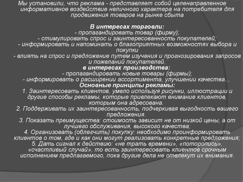 Мы установили, что реклама - представляет собой целенаправленноеинформативное воздействие неличного характера на потребителя для