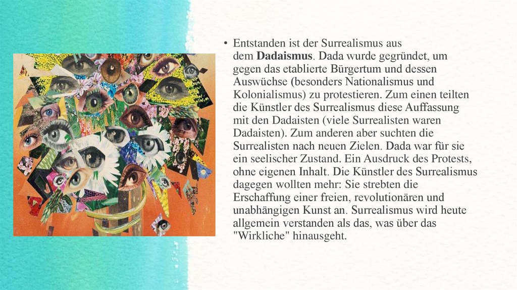 • Entstanden ist der Surrealismus ausdem Dadaismus. Dada wurde gegründet, um