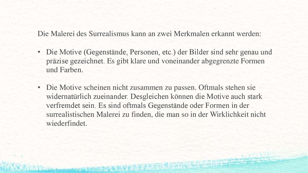 Die Malerei des Surrealismus kann an zwei Merkmalen erkannt werden:• Die Motive (Gegenstände, Personen, etc.) der Bilder sind sehr genau und