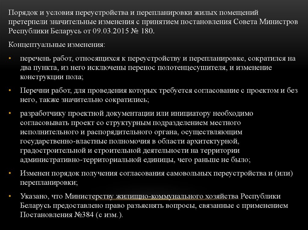 Порядок и условия переустройства и перепланировки жилых помещенийпретерпели значительные изменения с принятием постановления Совета Министров