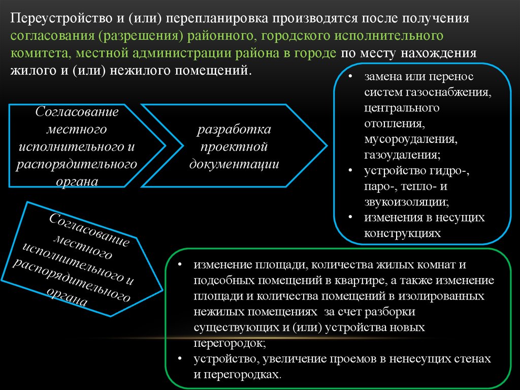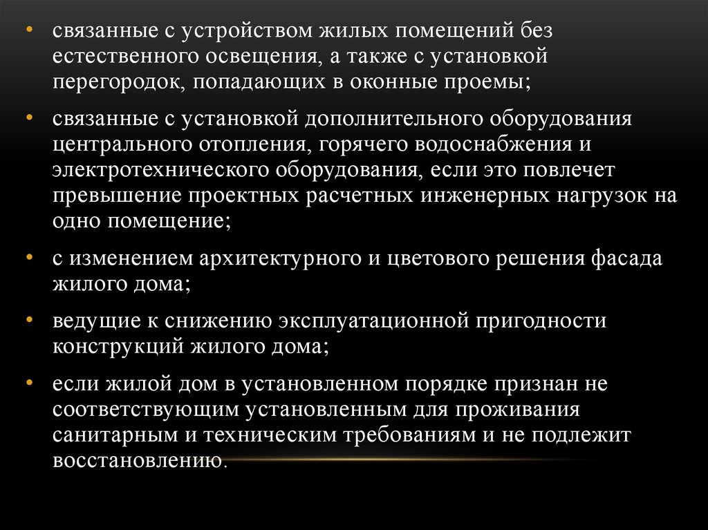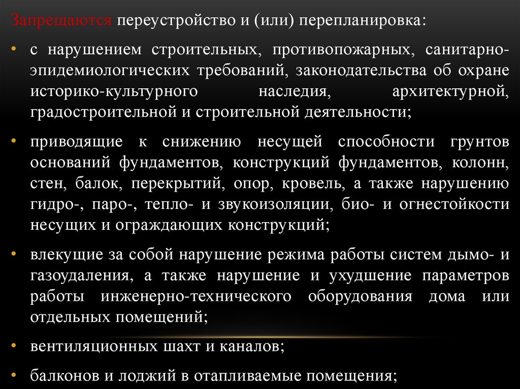 Запрещаются переустройство и (или) перепланировка:• с нарушением строительных, противопожарных, санитарноэпидемиологических требований, законодательства об охране