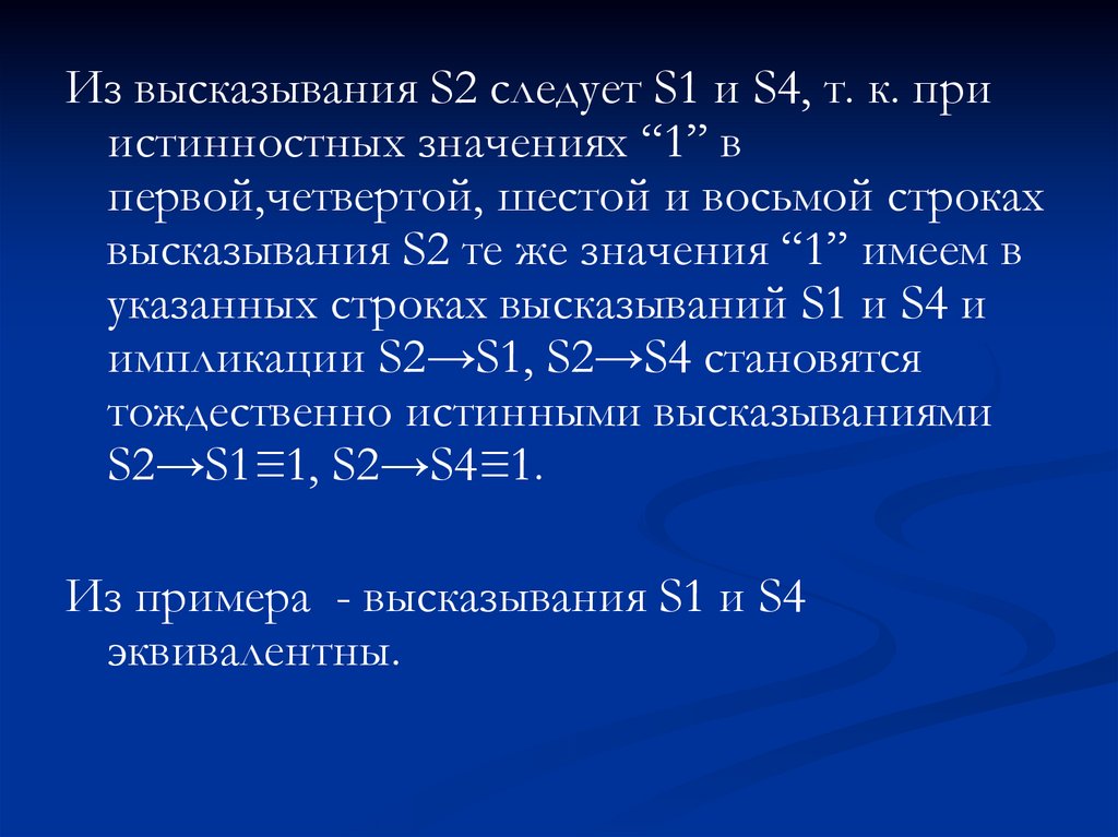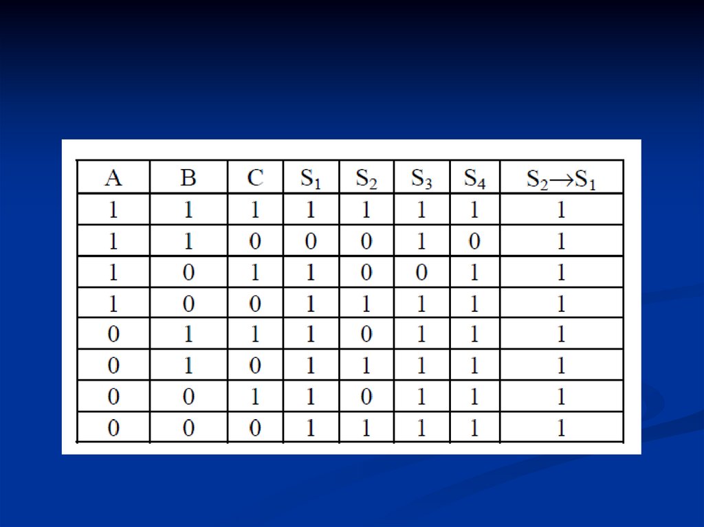 Из высказывания S2 следует S1 и S4, т. к. приистинностных значениях “1” в