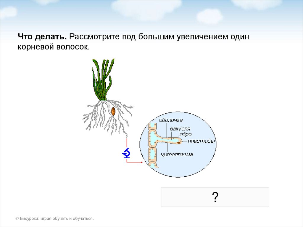 Что делать. Рассмотрите корни проростков пшеницы. В среднейчасти корня найдите и рассмотрите корневые волоски.