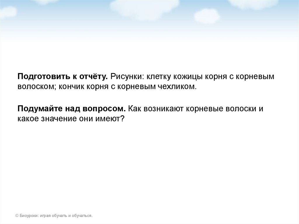 Подготовить к отчёту. Рисунки: клетку кожицы корня с корневымволоском; кончик корня с корневым чехликом.