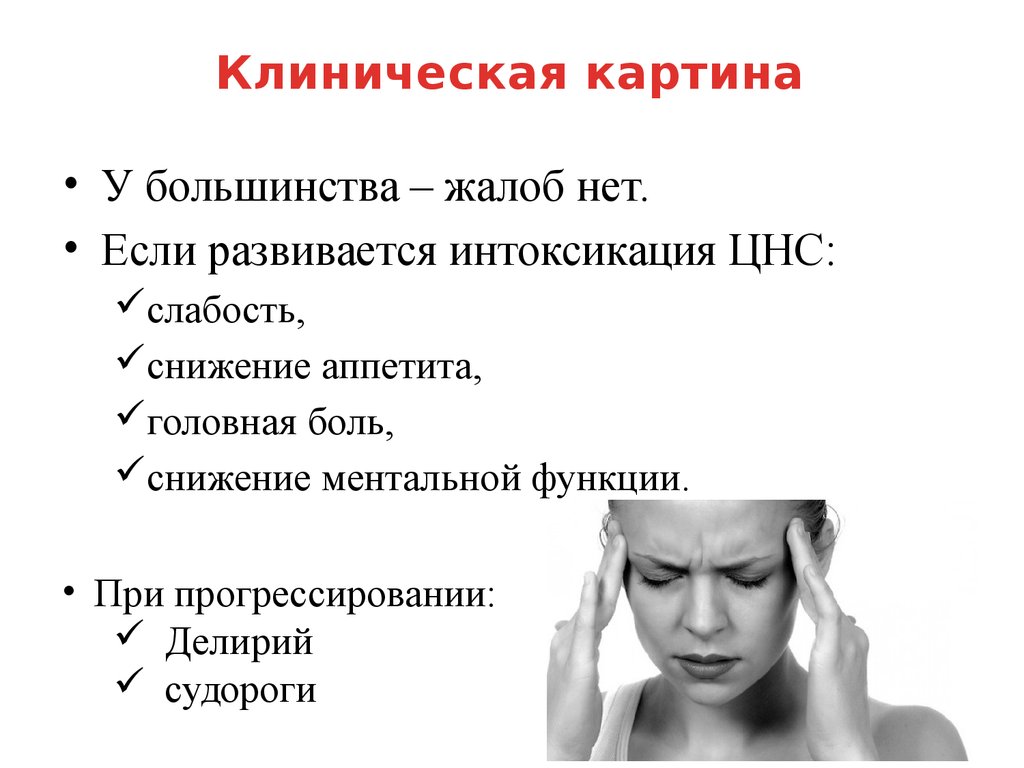 • Если развивается интоксикация ЦНС: