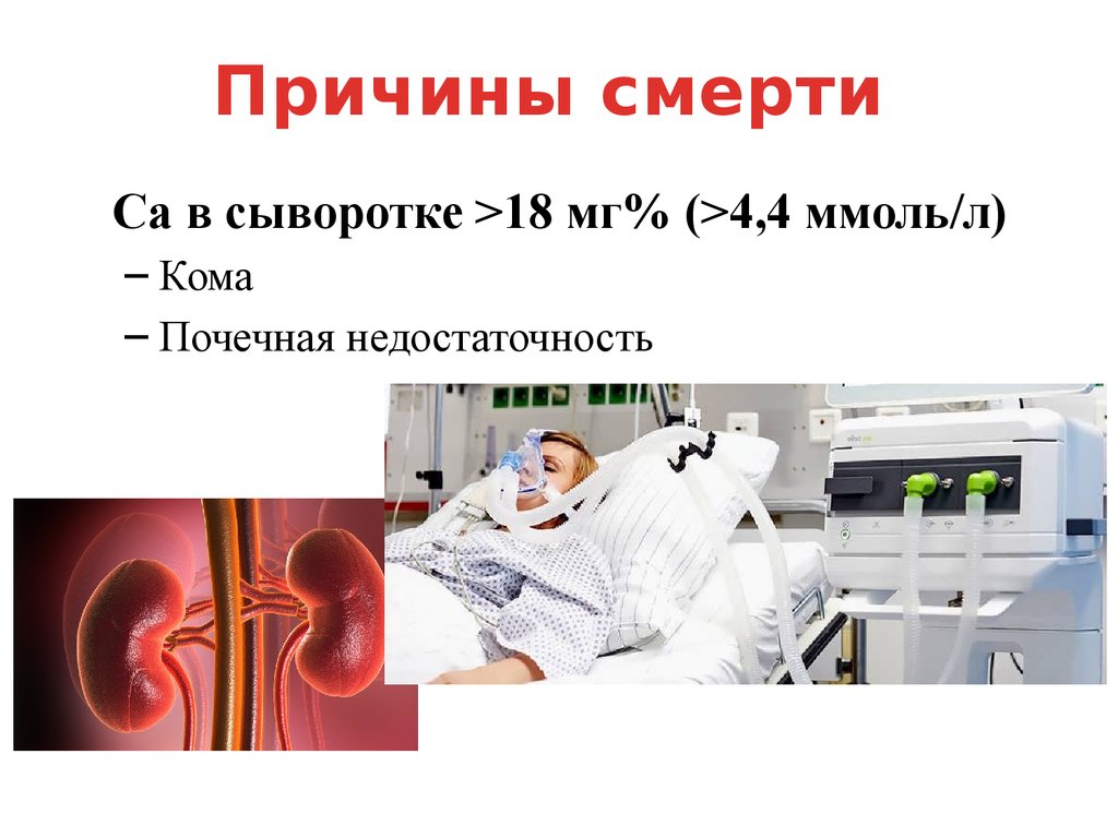 Причины смертиСа в сыворотке >18 мг% (>4,4 ммоль/л)
