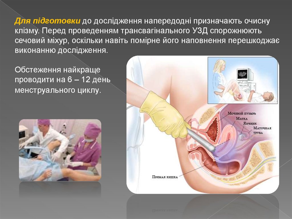 • Трансвагінальне обстеження- проведення ультразвукового дослідження через піхву, яке