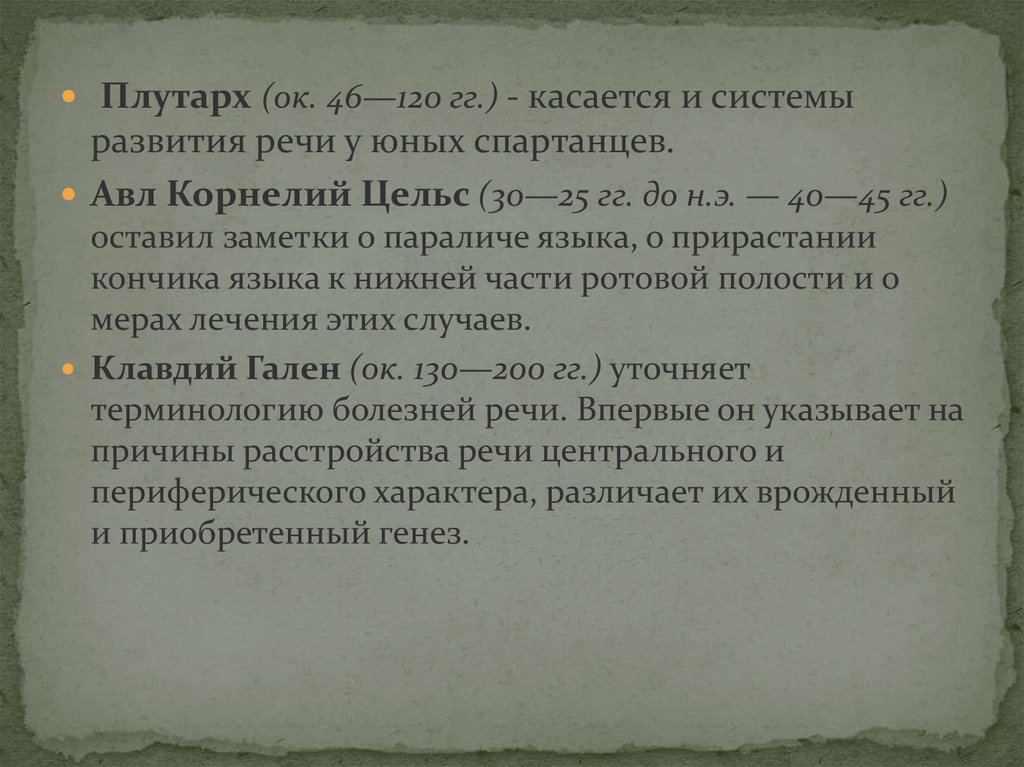 Плутарх (ок. 46—120 гг.) - касается и системыразвития речи у юных спартанцев.