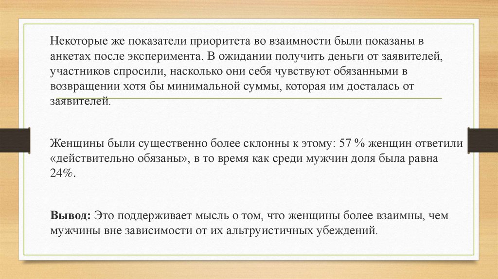 Вывод: Это поддерживает мысль о том, что женщины более взаимны, чем