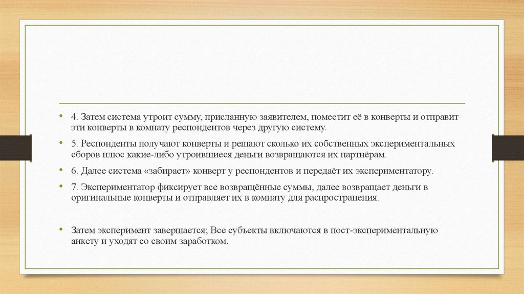 • 5. Респонденты получают конверты и решают сколько их собственных экспериментальных