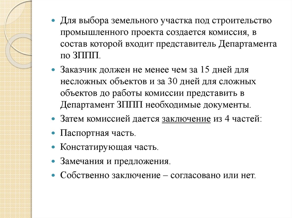 Для выбора земельного участка под строительствопромышленного проекта создается комиссия, в