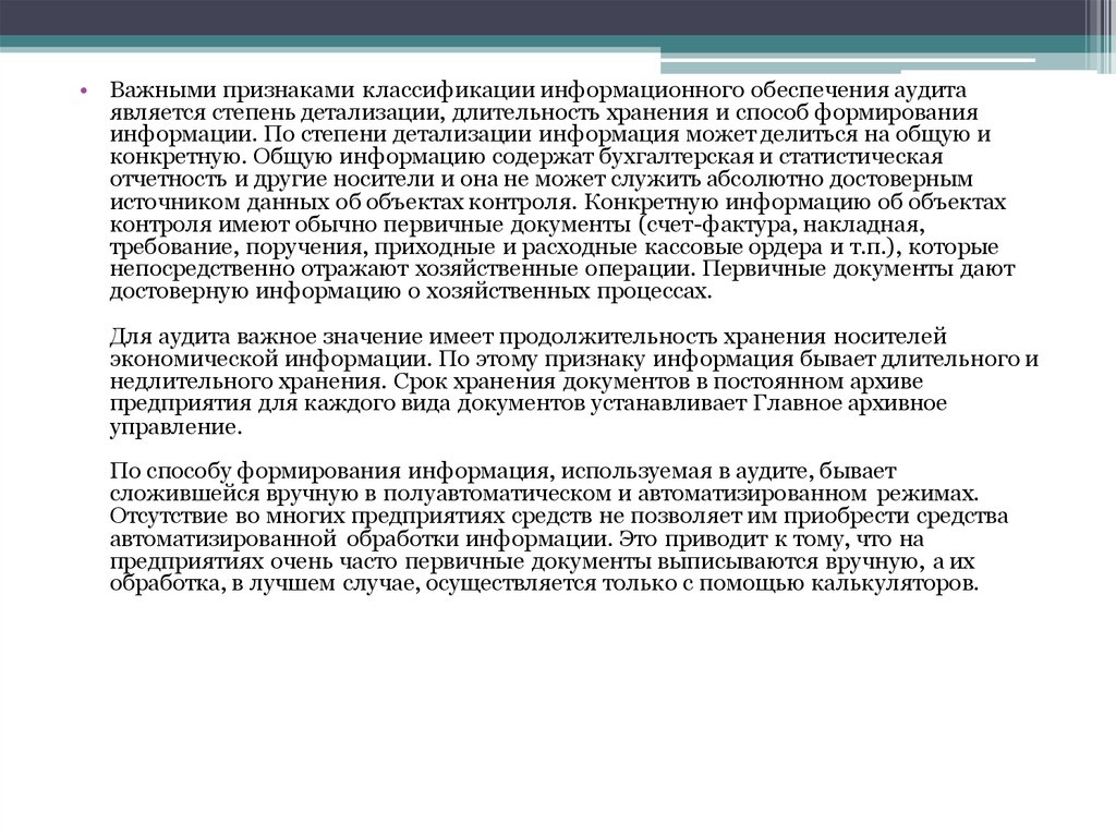 • Важными признаками классификации информационного обеспечения аудитаявляется степень детализации, длительность хранения и способ формирования