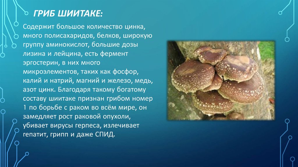 ГРИБ ШИИТАКЕ:Содержит большое количество цинка,
