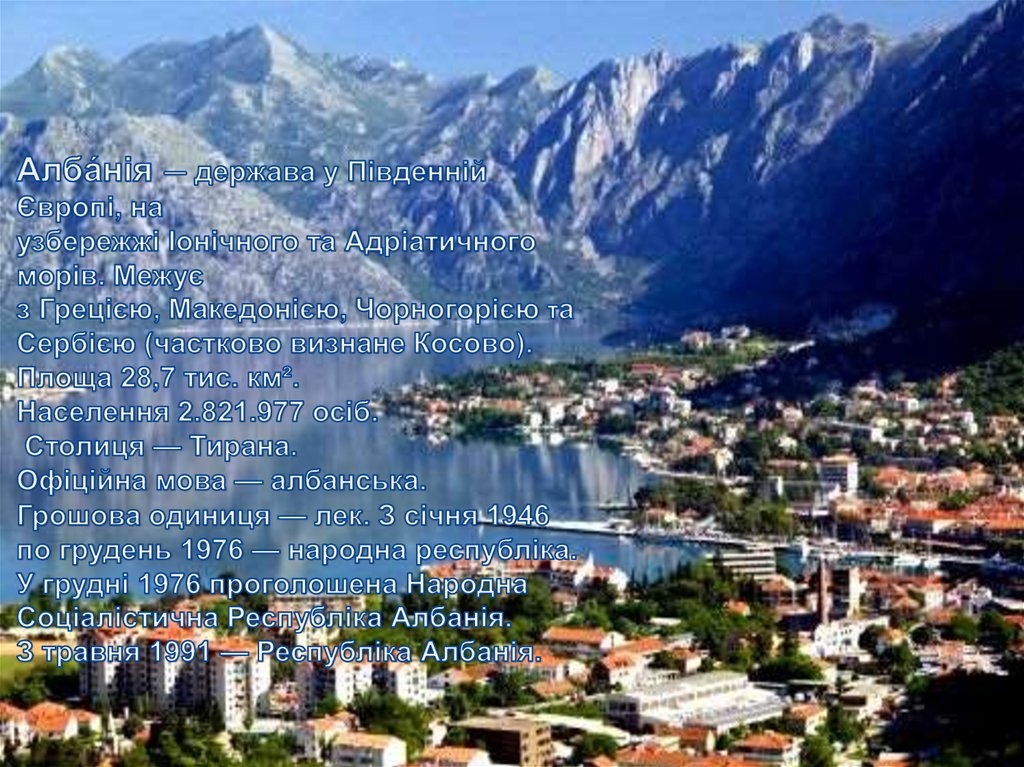 Алба́нія — держава у Південній Європі, наузбережжі Іонічного та Адріатичного морів. Межує