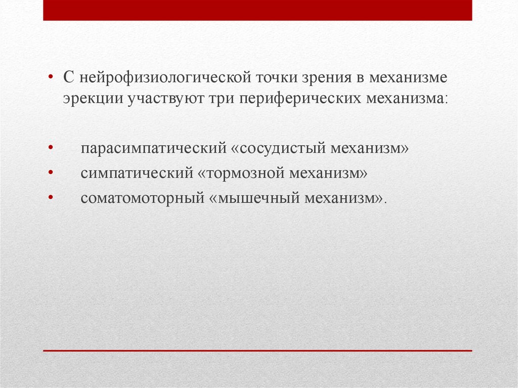• С нейрофизиологической точки зрения в механизмеэрекции участвуют три периферических механизма: