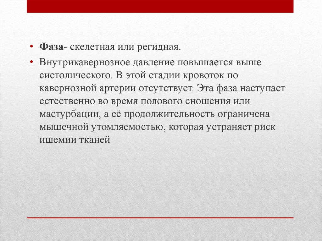 • Фаза- скелетная или регидная.• Внутрикавернозное давление повышается выше