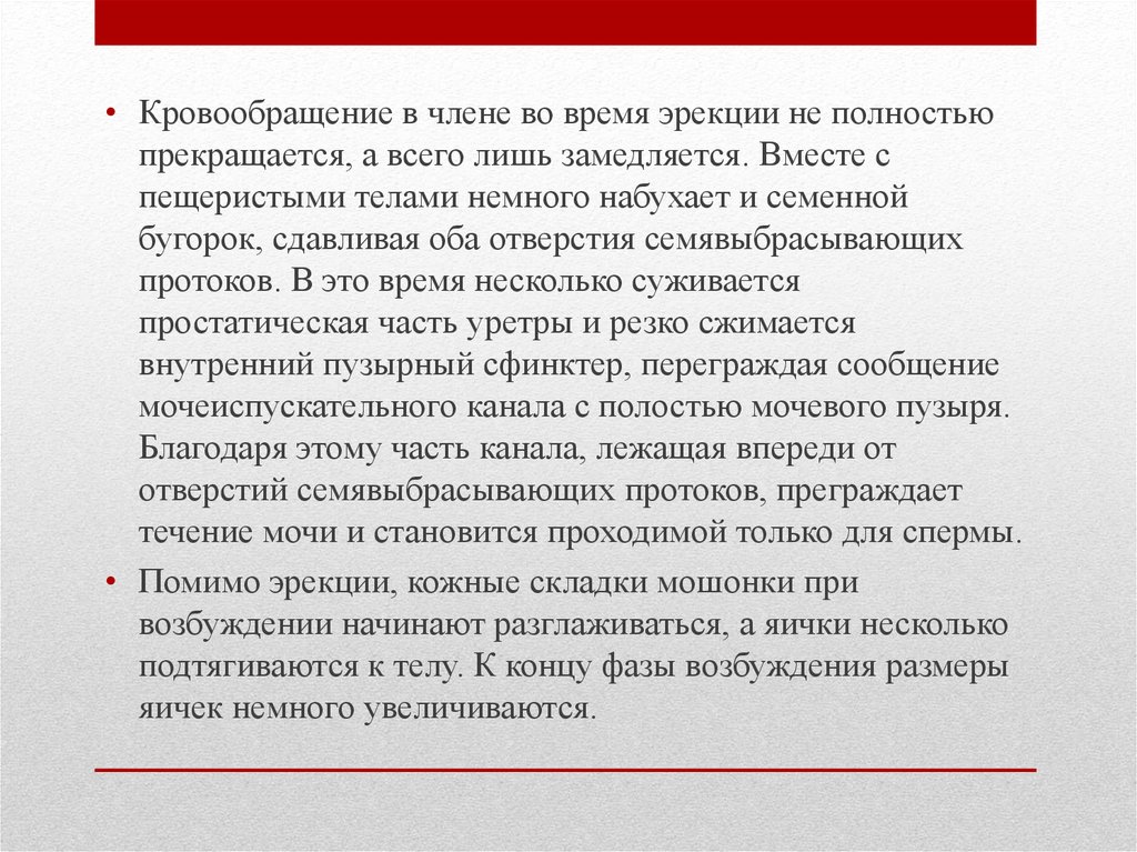 • Кровообращение в члене во время эрекции не полностьюпрекращается, а всего лишь замедляется. Вместе с
