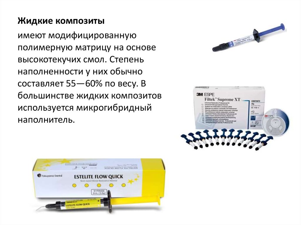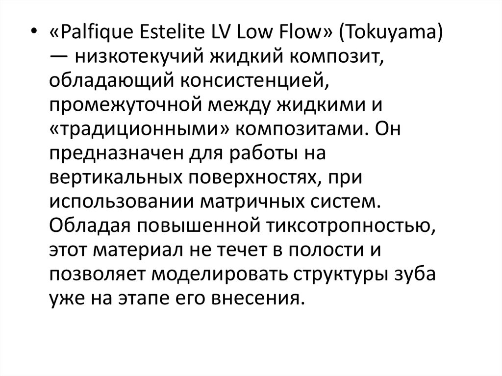 • «Palfique Estelite LV Low Flow» (Tokuyama)— низкотекучий жидкий композит,