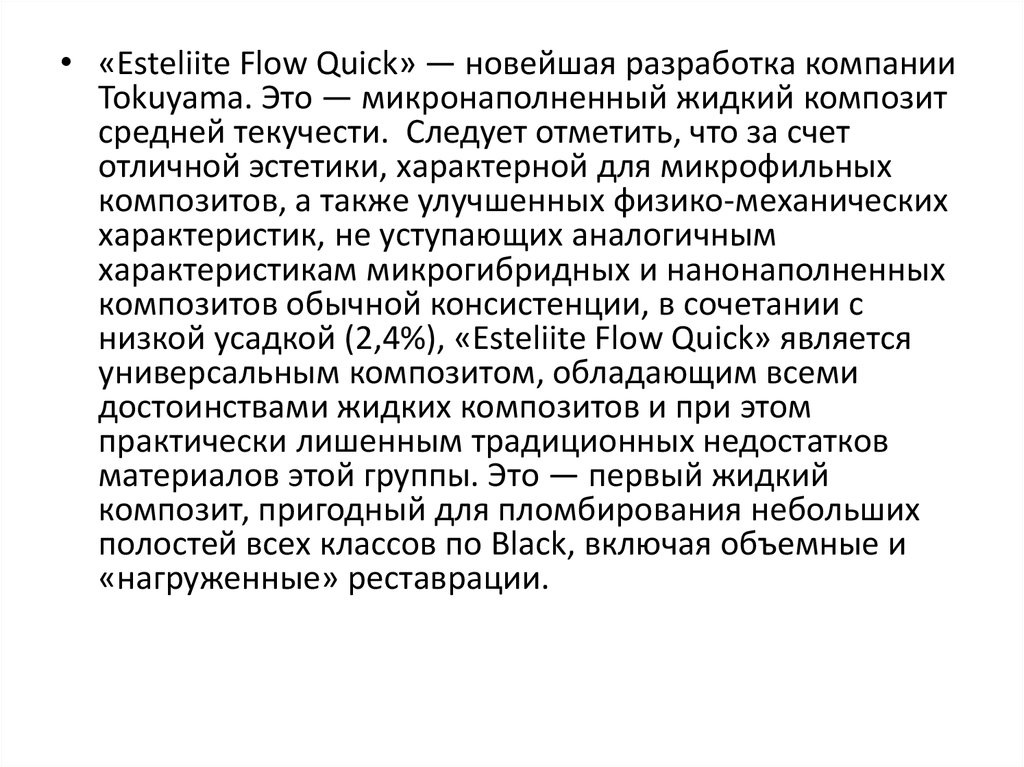 • «Esteliite Flow Quick» — новейшая разработка компанииTokuyama. Это — микронаполненный жидкий композит