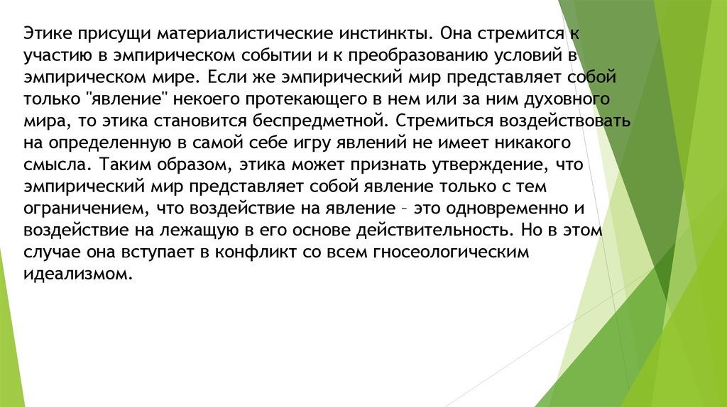 Этике присущи материалистические инстинкты. Она стремится кучастию в эмпирическом событии и к преобразованию условий в