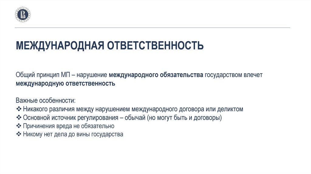 МЕЖДУНАРОДНАЯ ОТВЕТСТВЕННОСТЬОбщий принцип МП – нарушение международного обязательства государством влечет