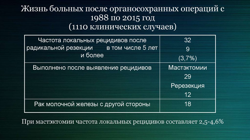 При мастэктомии частота локальных рецидивов составляет 2,5-4,6%