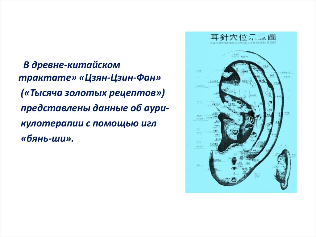 В странах Востока аурикулотерапия применялась издавна.Согласно данным Sonen Kichan