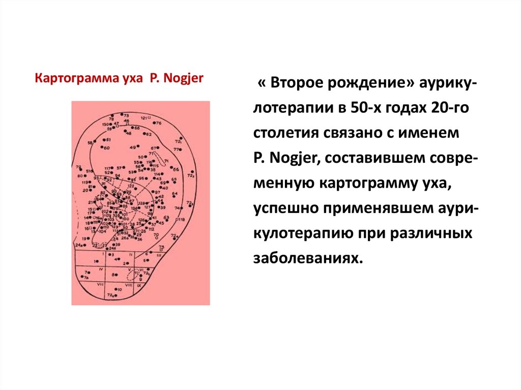 Картограмма уха P. Nogjer« Второе рождение» аурикулотерапии в 50-х годах 20-го