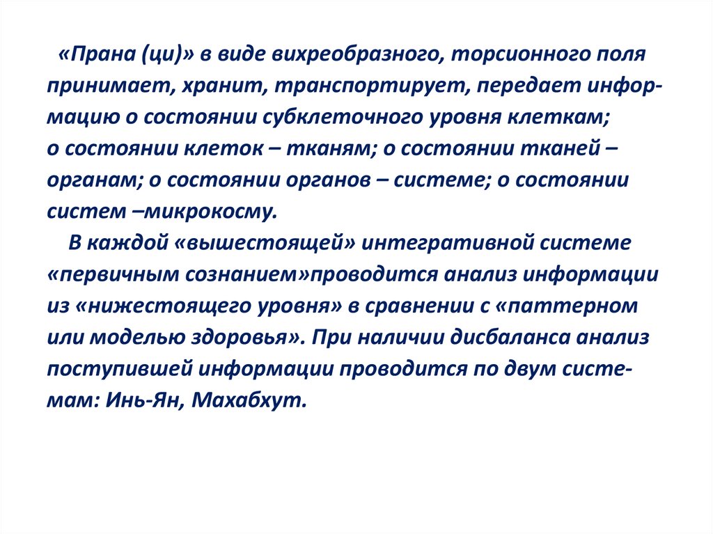 «Прана (ци)» в виде вихреобразного, торсионного поляпринимает, хранит, транспортирует, передает информацию о состоянии субклеточного уровня клеткам;