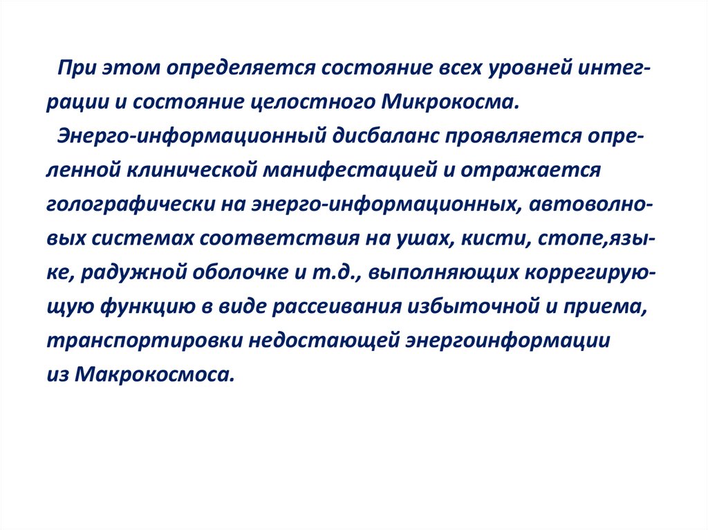 При этом определяется состояние всех уровней интеграции и состояние целостного Микрокосма.Энерго-информационный дисбаланс проявляется опреленной клинической манифестацией и отражается
