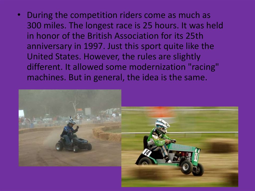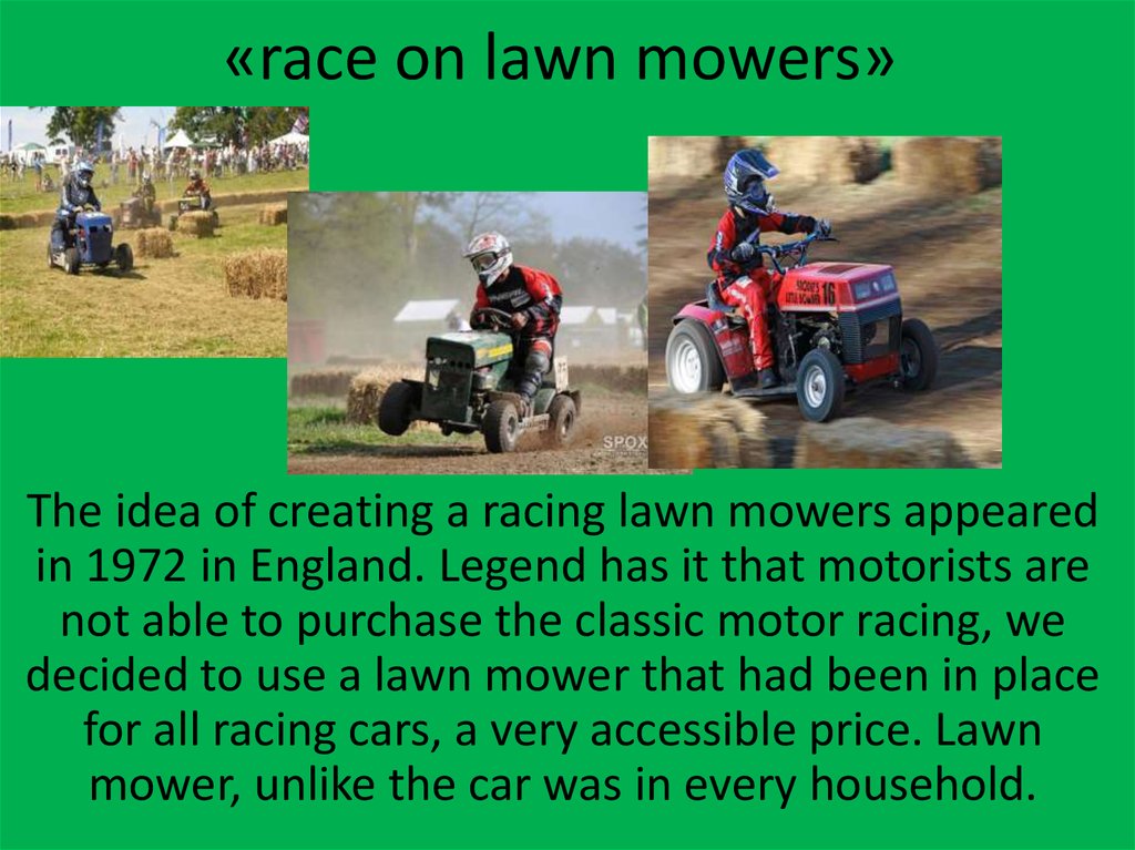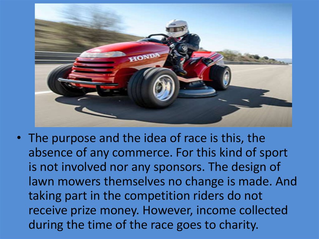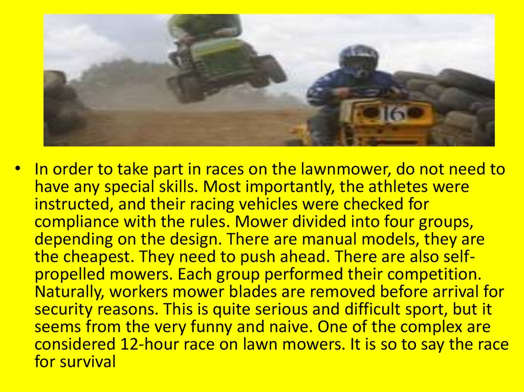 • In order to take part in races on the lawnmower, do not need tohave any special skills. Most importantly, the athletes were