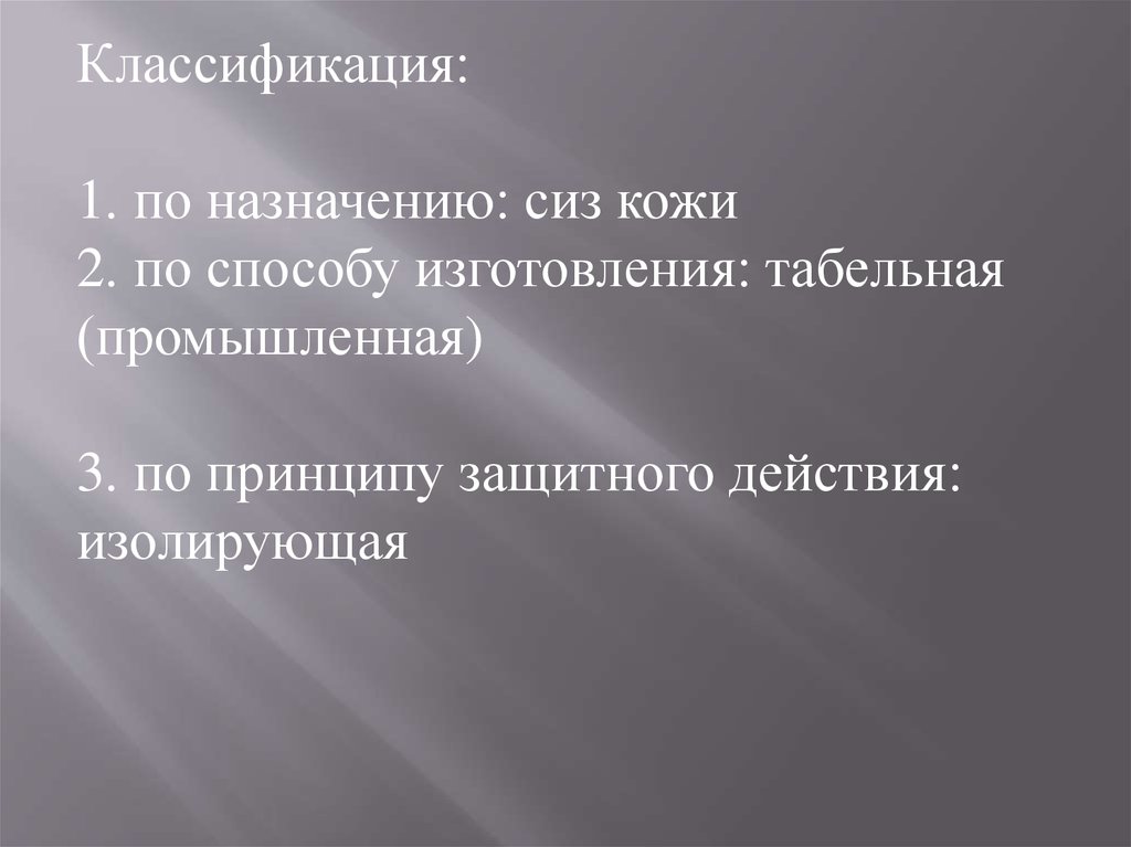 Классификация:1. по назначению: сиз кожи