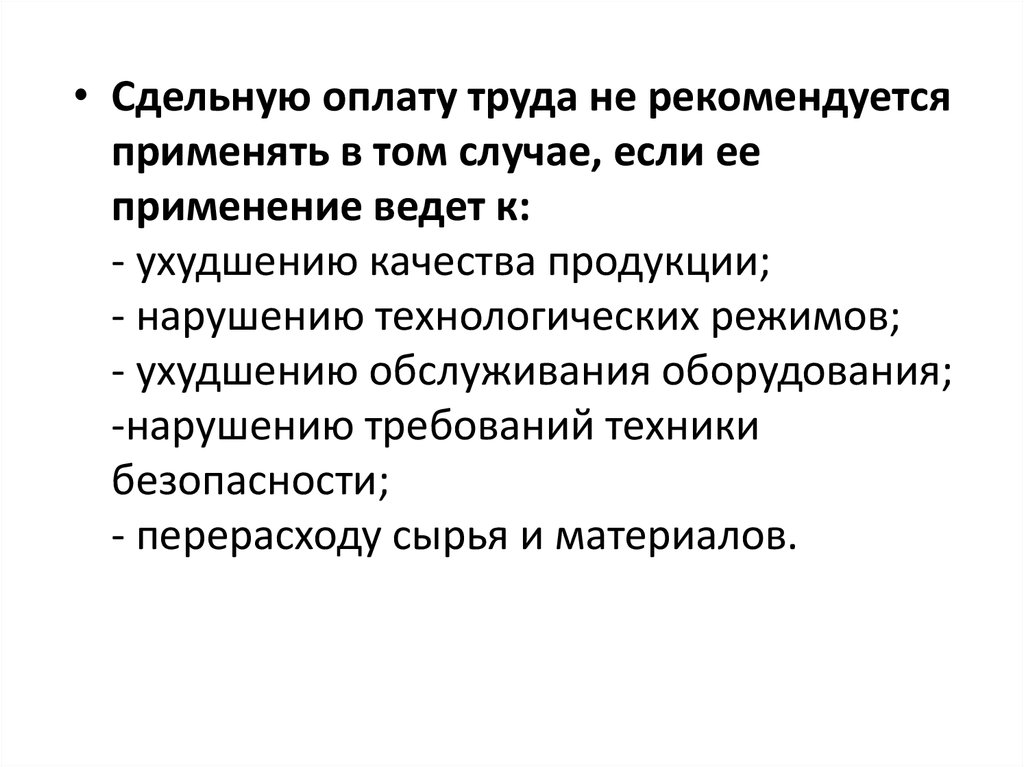 • Сдельную оплату труда не рекомендуетсяприменять в том случае, если ее