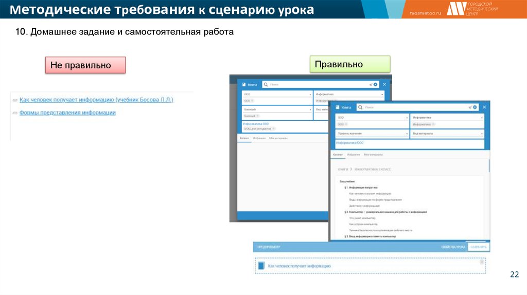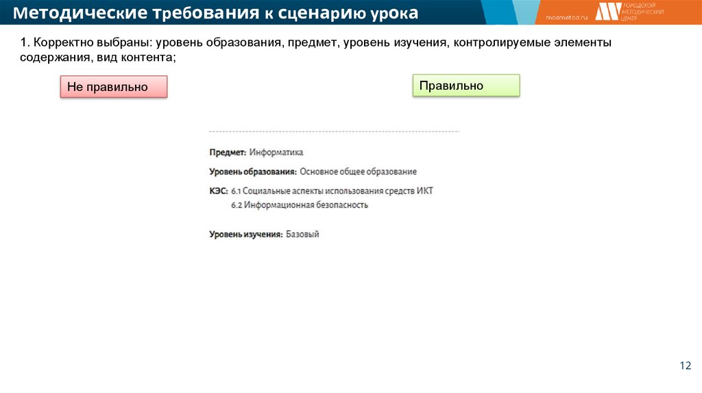 Методические требования к сценарию урока1. Корректно выбраны: уровень образования, предмет, уровень изучения, контролируемые элементы