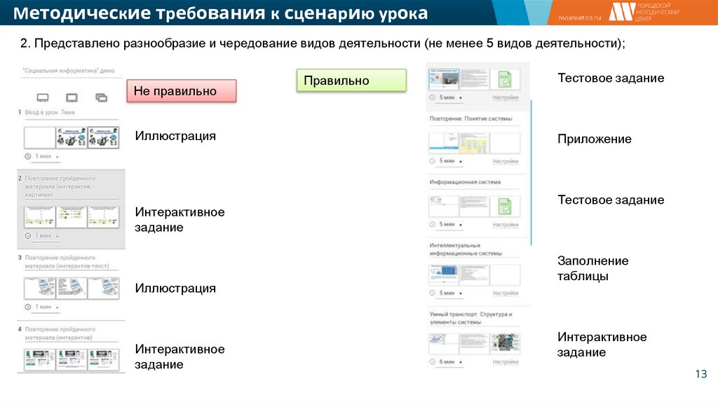 Методические требования к сценарию урока2. Представлено разнообразие и чередование видов деятельности (не менее 5 видов деятельности);